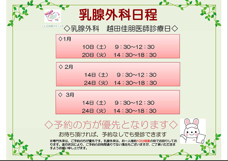 当院は駅前の小さなクリニックですので、スペースの問題上マンモグラフィー検査は受けられませんが、乳癌の専門医師(乳腺外科医)による外来診療をご利用頂けます(詳しい日程は最新のお知らせをご確認下さい)。