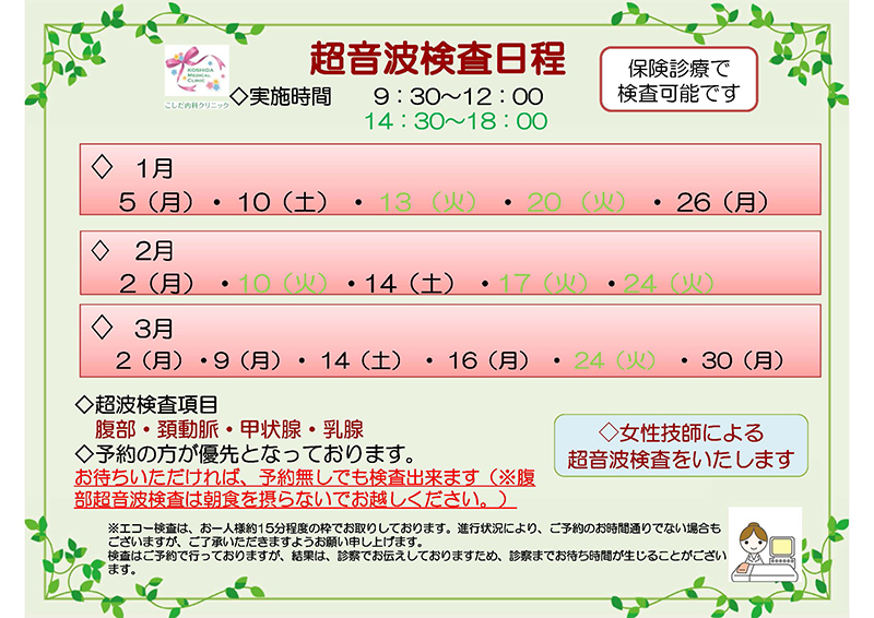 腹部超音波検査・レントゲン検査は当院で随時受けられます。